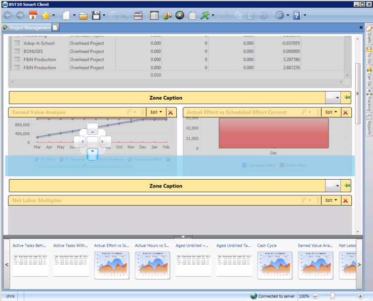 The screen changes back to the normal dashboard view with your changes displayed. - When you exit, save your preferences as a view. For more information, see Manage Views.