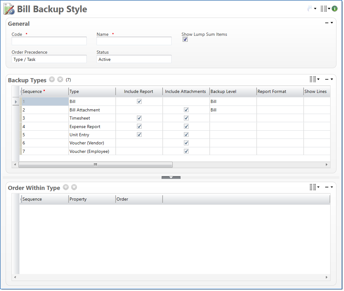 | Ordered Within Type | Indicates if Order options are selected. This only applies to Backup Types Timesheet, Expense Report, Unit Entry and Voucher (Vendor and Employee). This displays blank for Backup Types Bill and Bill Attachment. | |||
