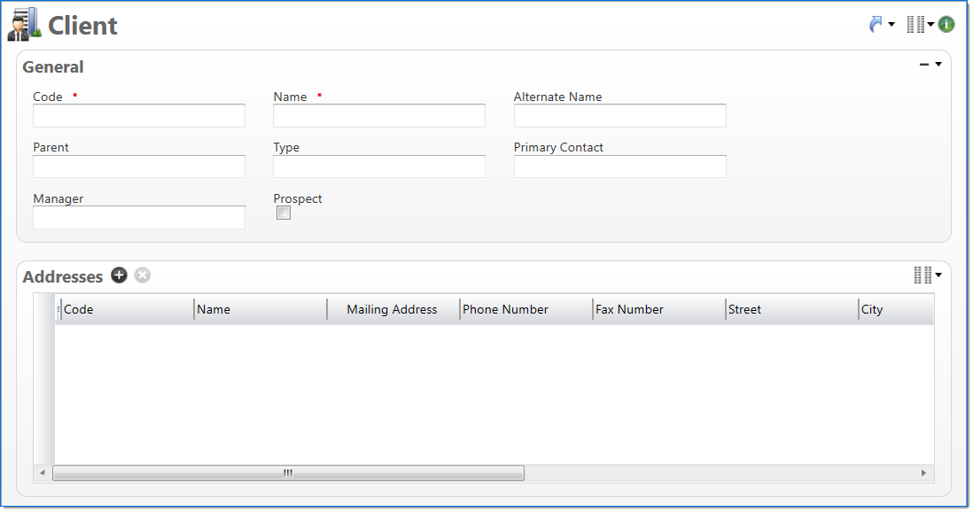 | Manager | Enter or select the employee who manages the relationship with the client or prospect. Only active or pending active employees can be selected. | |