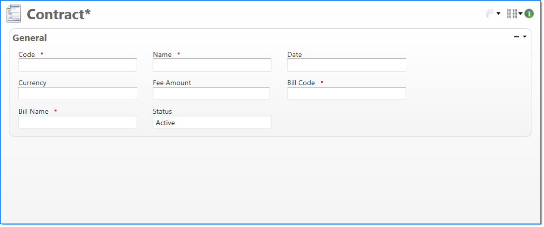 | Currency | Enter the currency of the contract. This field is required when a value is entered in the Fee Amount. | |