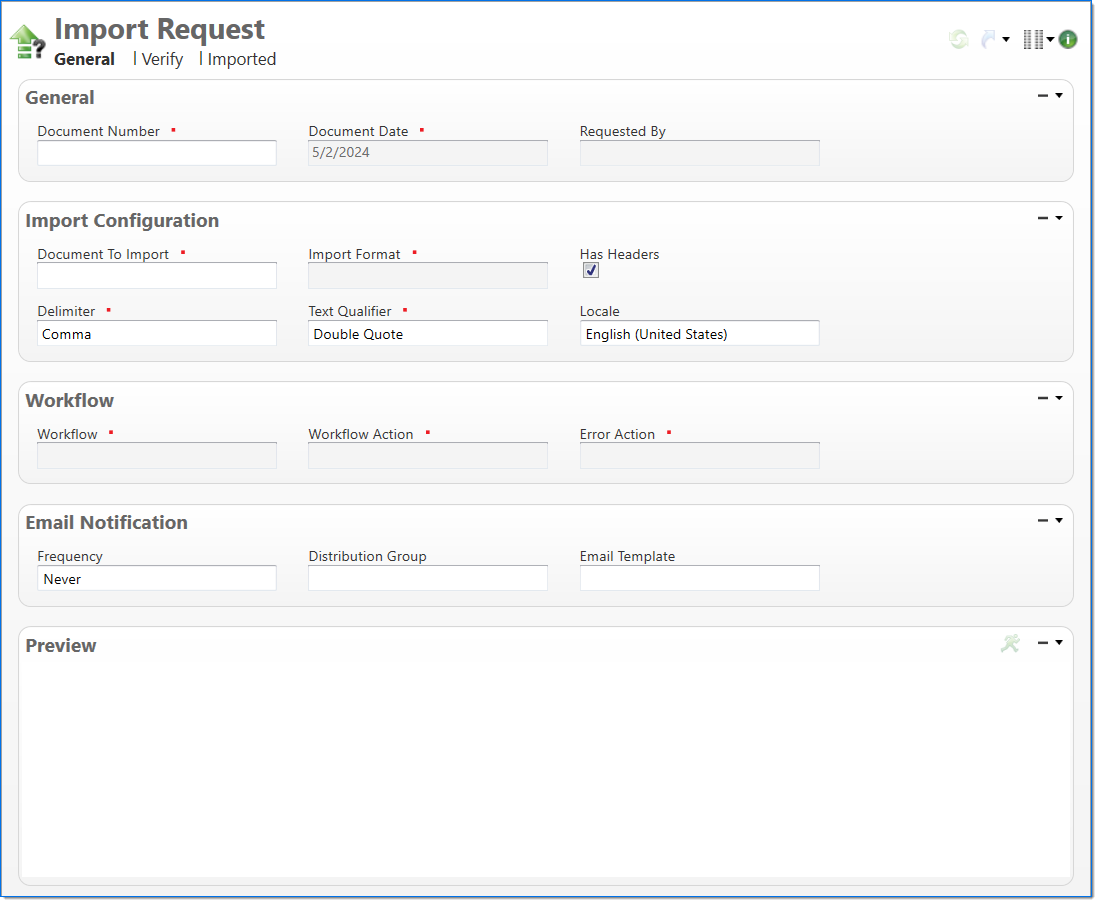 button on the toolbar to display the top ten rows from the file in the Preview area. This allows you to verify that the data values (one column for each) in the import file are matched correctly with the selected document type format. Each row corresponds to a single row in the attached file. If the attached file does not match the expected format, an error will display in the Preview area.