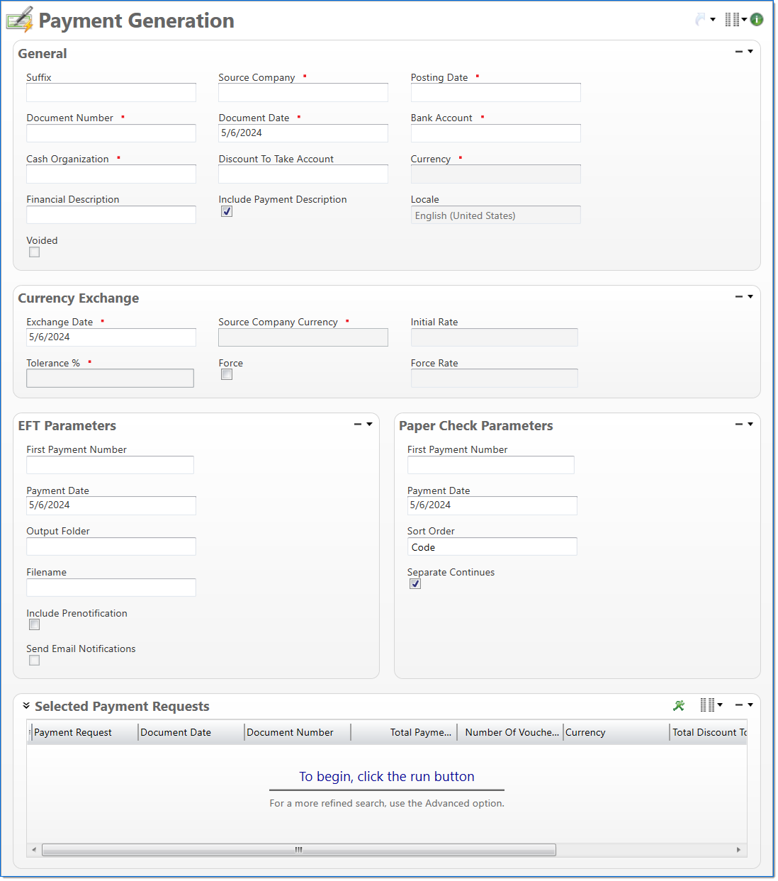 The Payment Generation screen allows you to select payment requests for payment and initiates the production of checks, reports, and EFT files. Once you have entered search criteria in the General area, you can use the Selected Payment Requests area to search for payment requests and then edit the list of what should be included.
