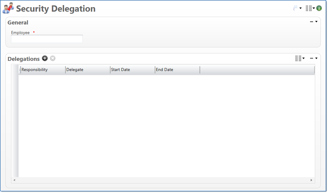 Delegate | Enter or select an employee. Only other employees with the same responsibility as the selected Employee are available. |