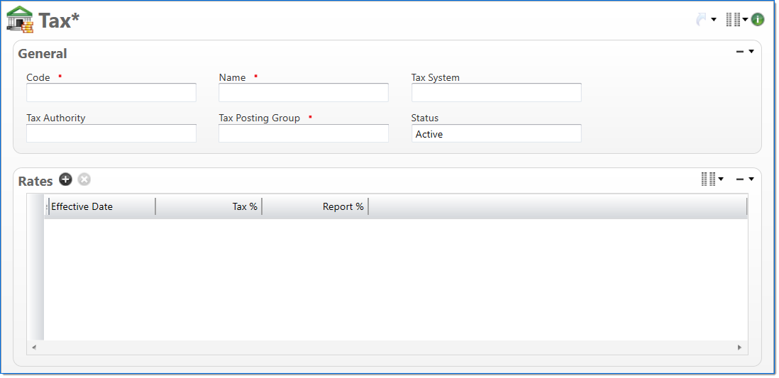 The Tax screen allows you to establish tax codes and assign rates to the codes. Tax codes and rates are used during financial transactions to calculate applicable tax amounts. During the transaction process, the tax rate with an Effective Date that is less than or equal to the transaction's document date is used. For example, when a tax code is used with a project, the system calculates the tax amount for the project's bills with the effective tax rates.