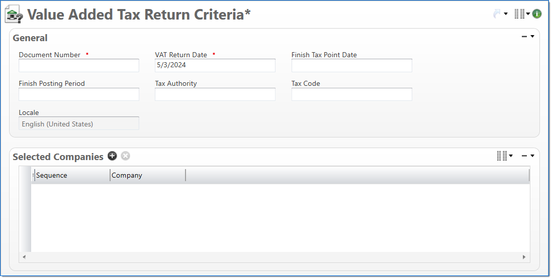 | Finish Posting Period | Enter or select a posting period. Only posting periods in a Adjustment, Closed, Open, or Pending Closed stage can be selected. The posting period is used to restrict which VAT Detail records to include in the tax return; VAT detail instances with a posting period that is equal or less than the Finish Posting Period will be included. A value must be selected in this field or the Finish Tax Point Date field. | |