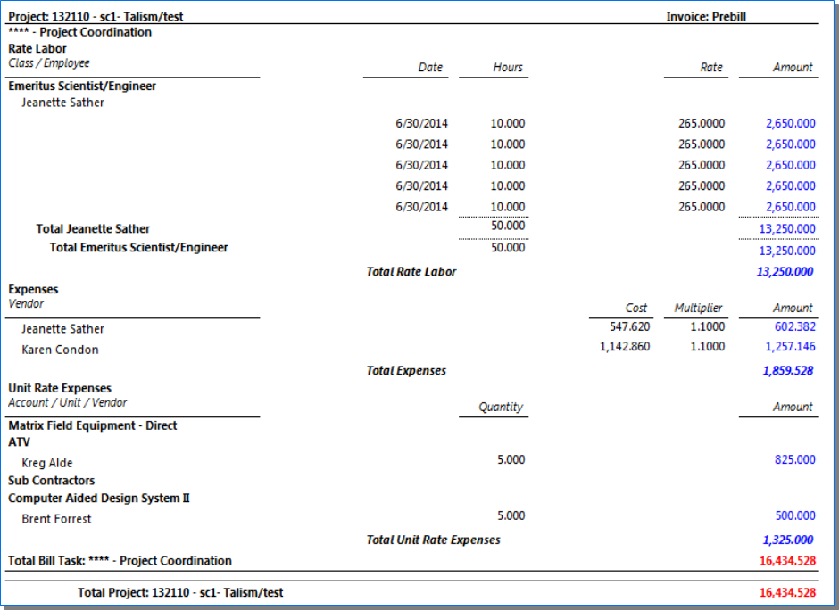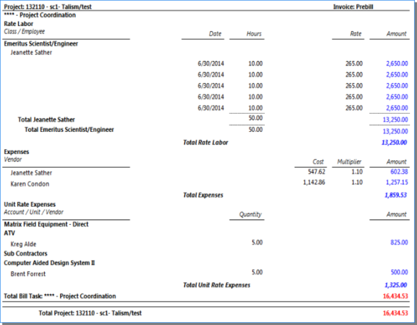 Shows Unit Expense Cost Rates and Multipliers on both the Prebill and Final Bill