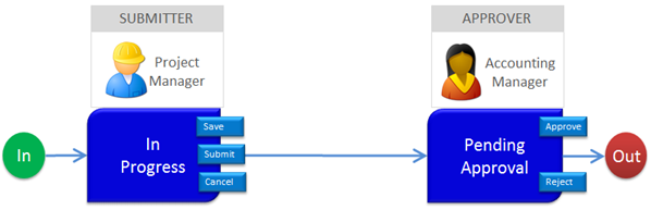 The following example outlines a simple, sample approval workflow. The workflow contains two states, In Progress and Pending Approval. From the In Progress state, all users with the Project Manager responsibility can access the document instance and perform one of three available actions, Save, Submit, or Cancel.